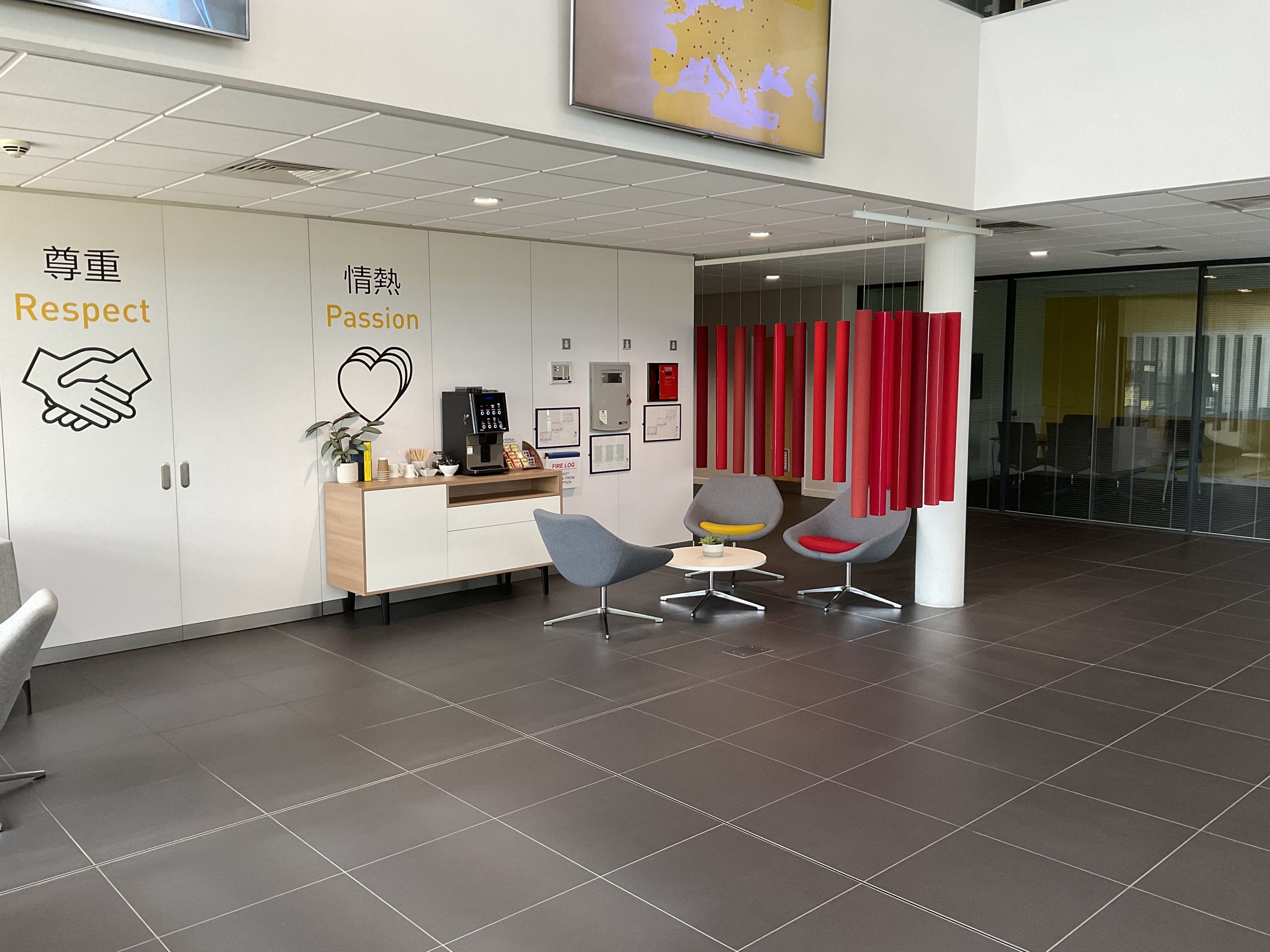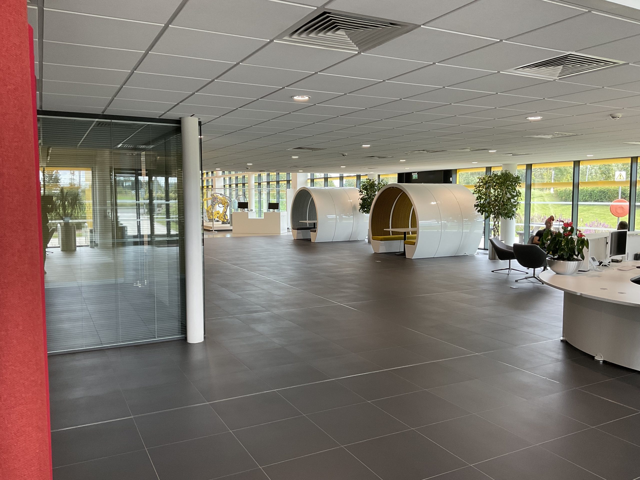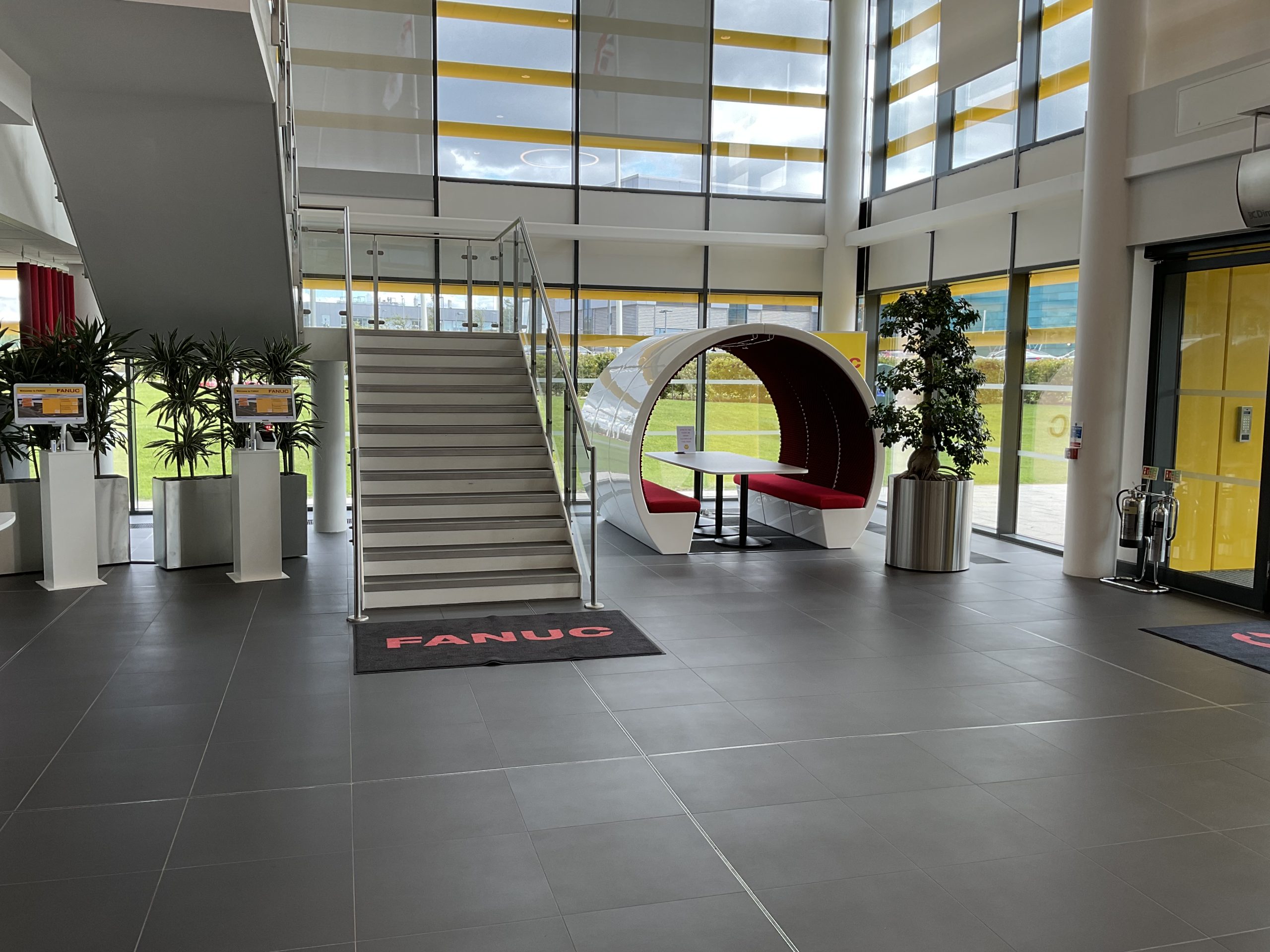 To achieve the desired aesthetic, the majority of the manufacturing office’s furniture was customised with FANUC’s logo and brand colours, creating an impressive entrance to the building.