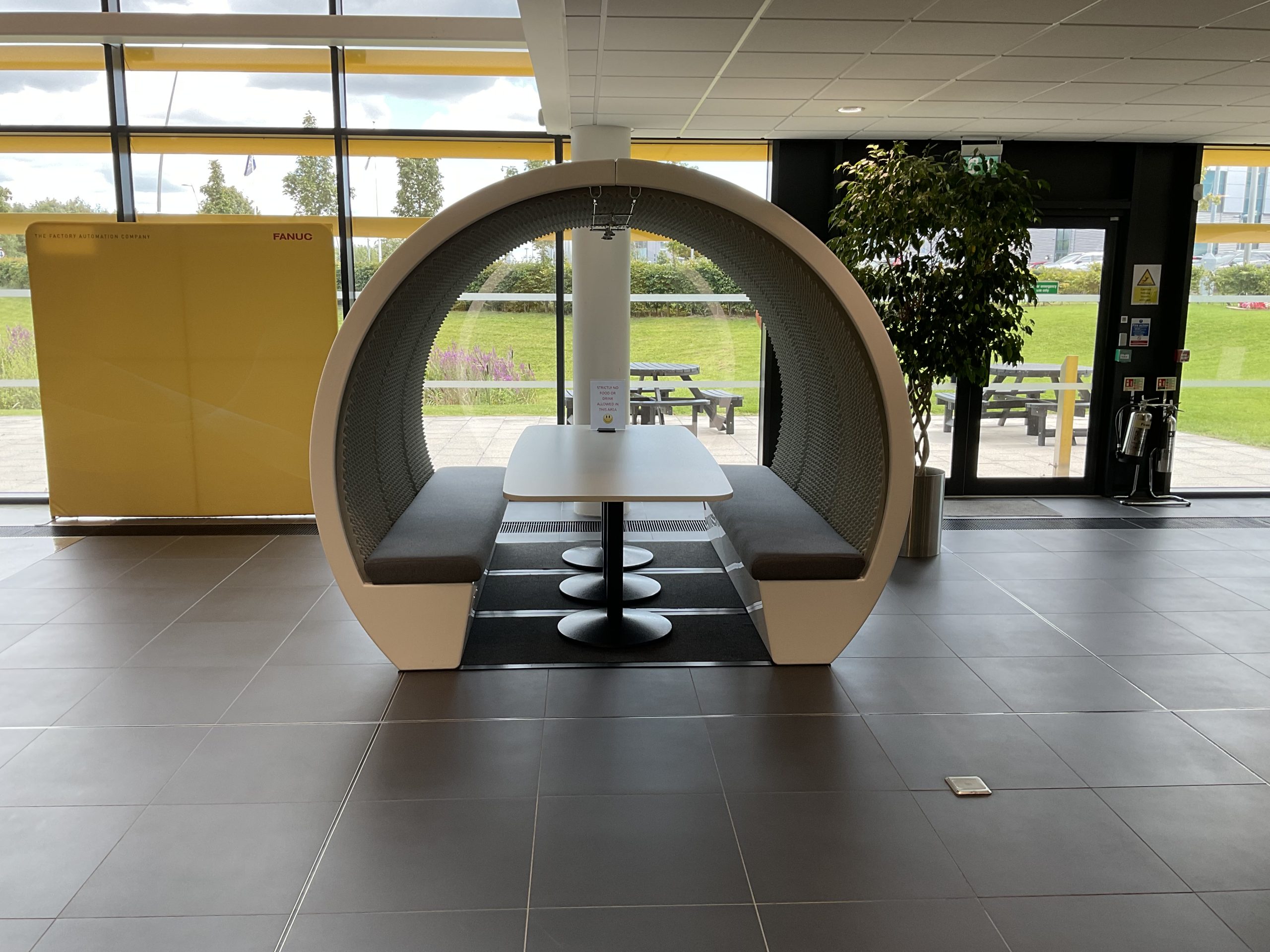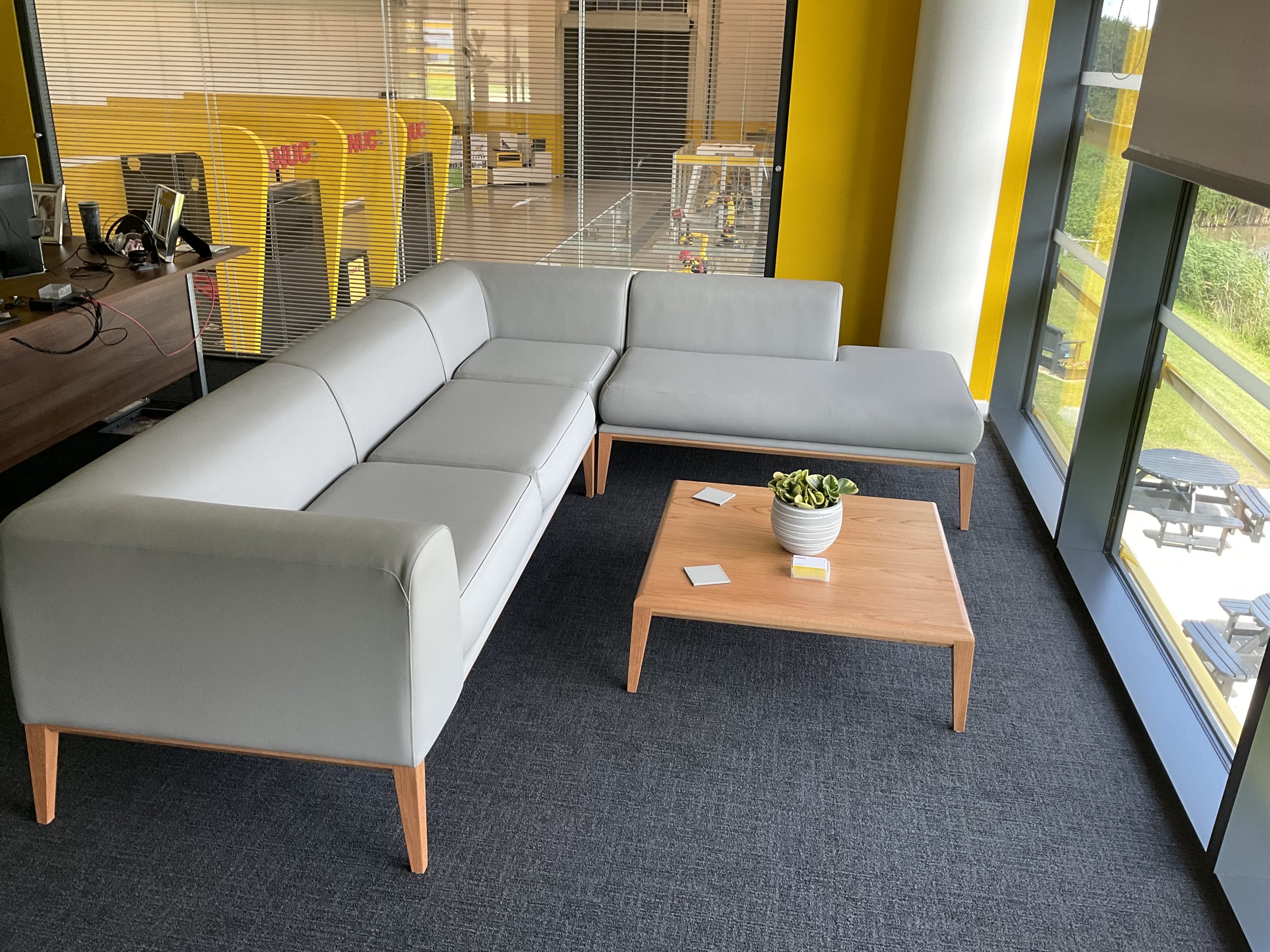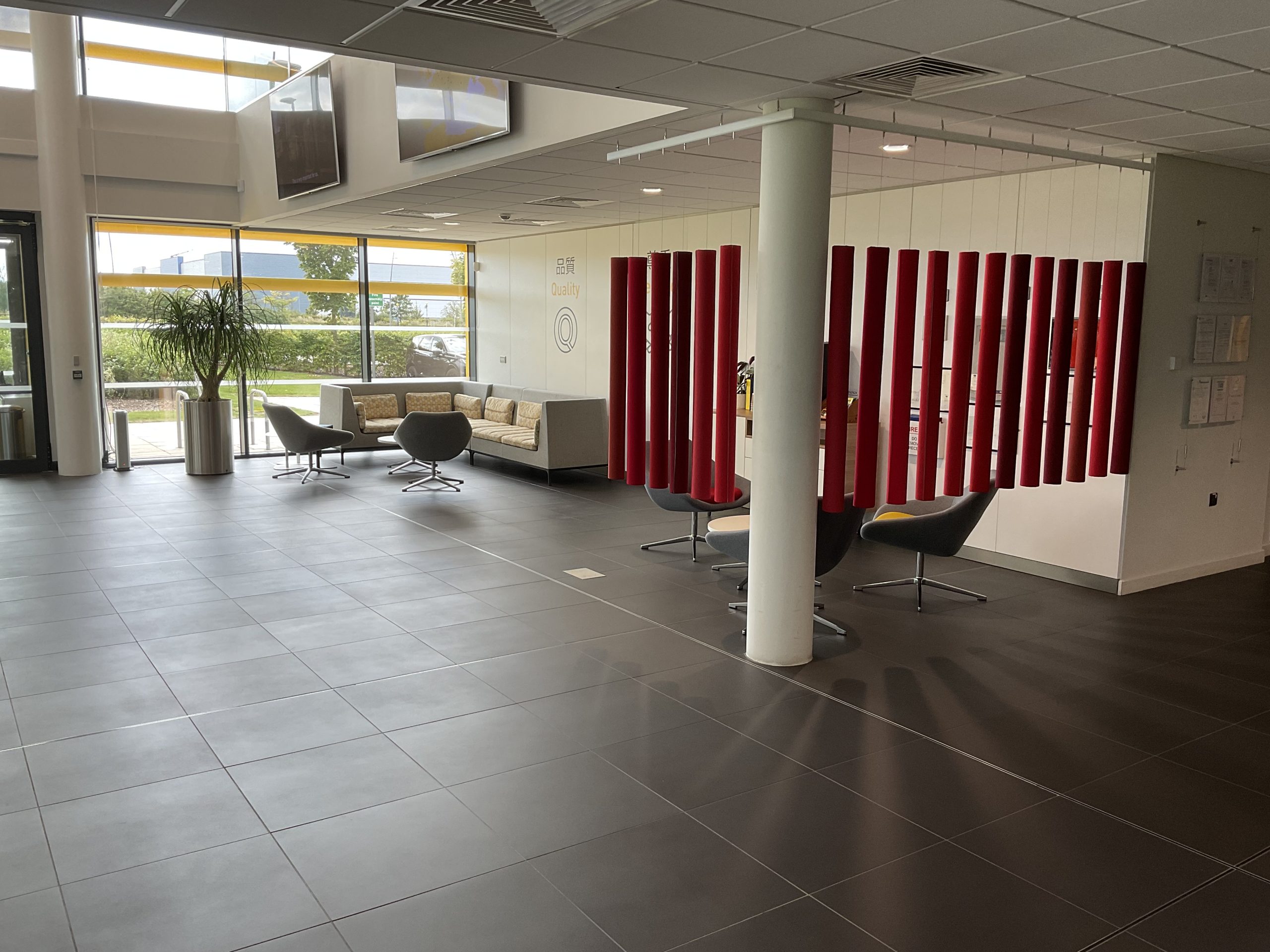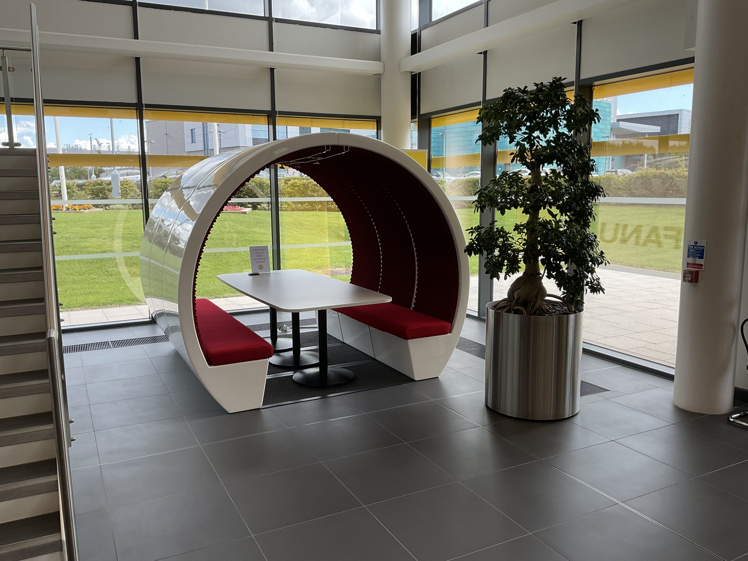 To achieve the desired aesthetic, the majority of the manufacturing office’s furniture was customised with FANUC’s logo and brand colours, creating an impressive entrance to the building.